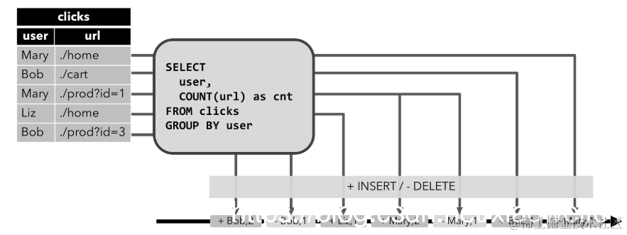 例如:针对UPDATE,我们用两个操作来表达,[DELETE] 数据+ [INSERT]数据。也就是先把之前的数据删除,然后再插入一条新的数据。针对DELETE,我们也可以对流中的数据进行编码,[DELETE]数据。