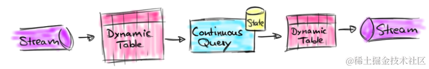 这是一个非常简单的示意图。该示意图描述了:我们通过建立动态表和连续查询来实现在无界流中的SQL操作。大家也可以看到,在Continuous上面有一个State,表示查询出来的结果会存储在State中,再下来Flink最终还是使用流来进行处理。