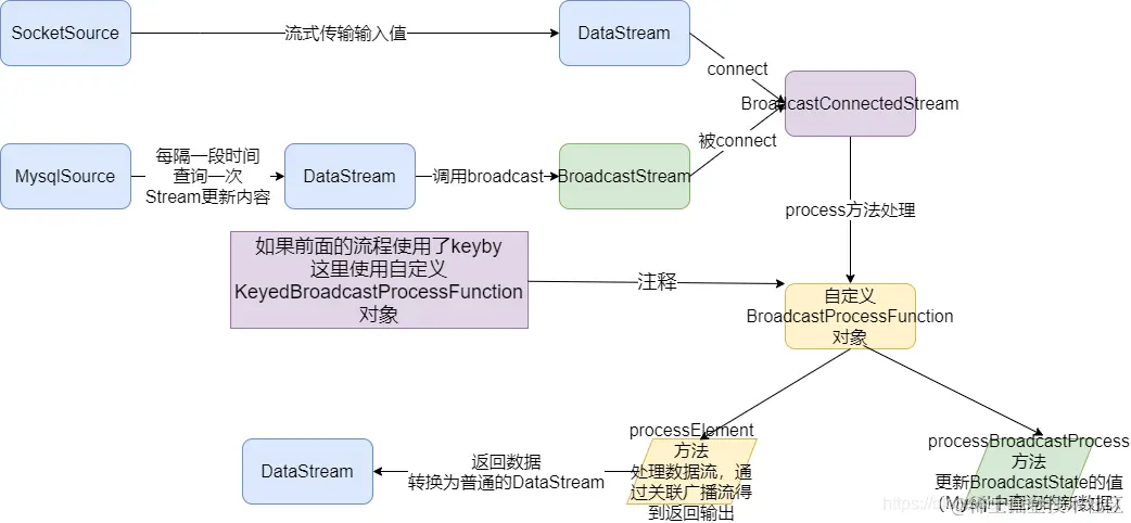 最后通过DataStream来连接(调用connect 方法)到Broadcasted Stream 上,