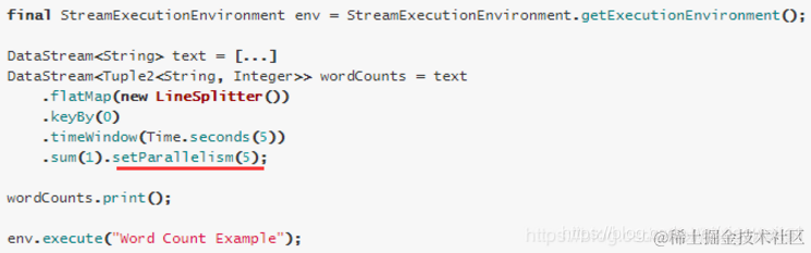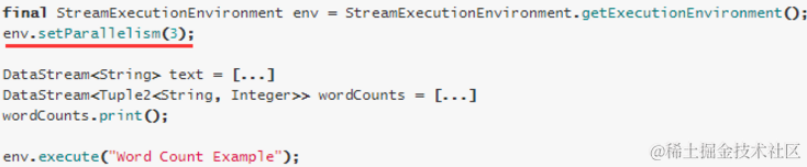 执行环境(任务)的默认并行度可以通过调用setParallelism()方法指定。为了以并行度3来执行所有的算子、数据源和data sink, 可以通过如下的方式设置执行环境的并行度: