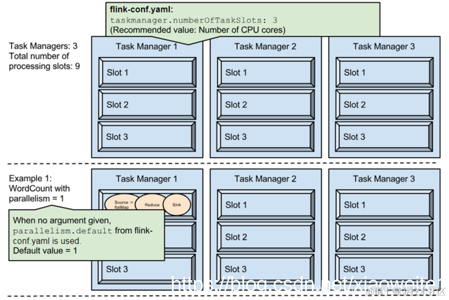 在fink-conf.yaml中 taskmanager.numberOfTaskSlots 默认值为1,即每个Task Manager上只有一个Slot ,此处是3