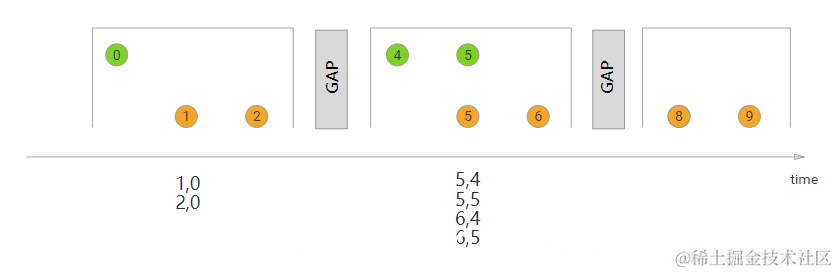 在这里,我们定义了一个会话窗口连接,其中每个会话被至少1ms的间隔分割。有三个会话,在前两个会话中,来自两个流的连接元素被传递给JoinFunction。在第三个会话中,绿色流中没有元素,所以⑧和⑨没有连接!