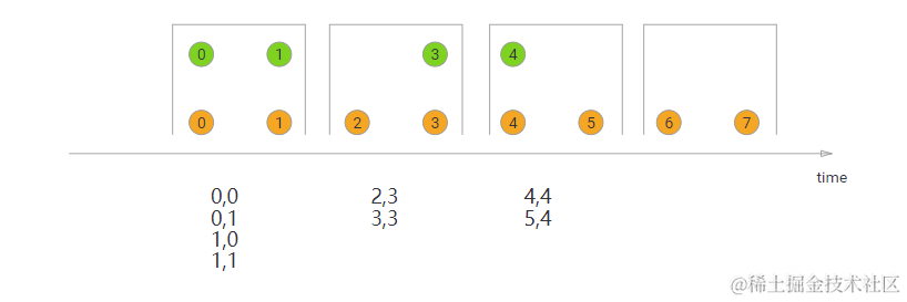 如图所示,我们定义了一个大小为2毫秒的翻滚窗口,结果窗口的形式为[0,1]、[2,3]、。。。。该图显示了每个窗口中所有元素的成对组合,这些元素将传递给JoinFunction。注意,在翻滚窗口[6,7]中没有发射任何东西,因为绿色流中不存在与橙色元素⑥和⑦结合的元素。