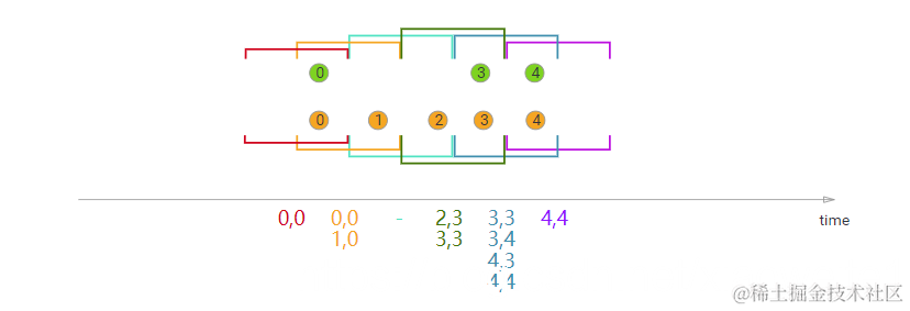 在本例中,我们使用大小为2毫秒的滑动窗口,并将其滑动1毫秒,从而产生滑动窗口[-1,0],[0,1],[1,2],[2,3]…。x轴下方的连接元素是传递给每个滑动窗口的JoinFunction的元素。在这里,您还可以看到,例如,在窗口[2,3]中,橙色②与绿色③连接,但在窗口[1,2]中没有与任何对象连接。
