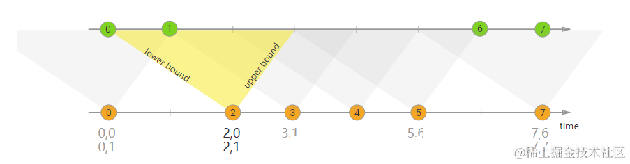 在上面的示例中,我们将两个流“orange”和“green”连接起来,其下限为-2毫秒,上限为+1毫秒。默认情况下,这些边界是包含的,但是可以应用.lowerBoundExclusive()和.upperBoundExclusive来更改行为