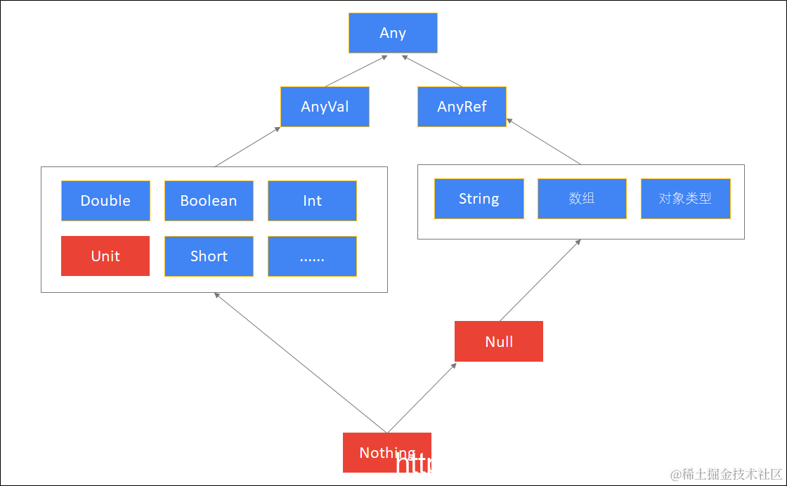 | Nothing | 所有类型的子类<br />不能直接创建该类型实例,某个方法抛出异常时,返回的就是Nothing类型,因为Nothing是所有类的子类,那么它可以赋值为任何类型 |