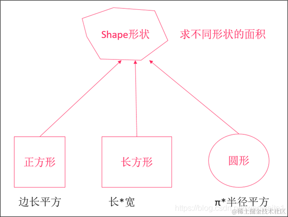 设计4个类,表示上述图中的继承关系,每一个形状都有自己求面积的方法,但是不同的形状计算面积的方法不同。