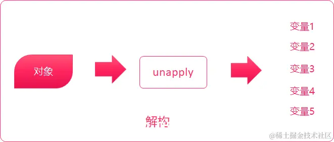 之前我们学习过了,实现一个类的伴生对象中的apply方法,可以用类名来快速构建一个对象。伴生对象中,还有一个unapply方法。与apply相反,unapply是将该类的对象,拆解为一个个的元素。