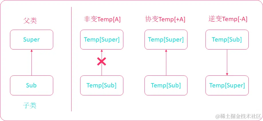 class Pair[-T],这种情况是逆变。类型B是A的子类型,Pair[A]反过来可以认为是Pair[B]的子类型。这种情况,参数化类型的方向和类型的方向是相反的。