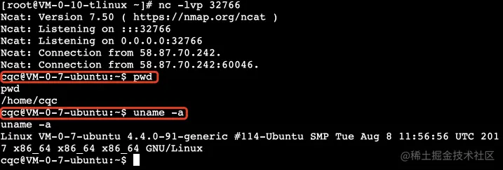 运行完毕之后,我们反过来观察下 A,就显示了来自某个 IP 和端口的连接,我们就可以输入命令来控制 B 了,比如这里我们输入了: