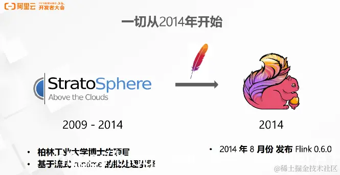 2009年Flink 诞生于柏林工业大学的一个大数据研究项目 StratoSphere。