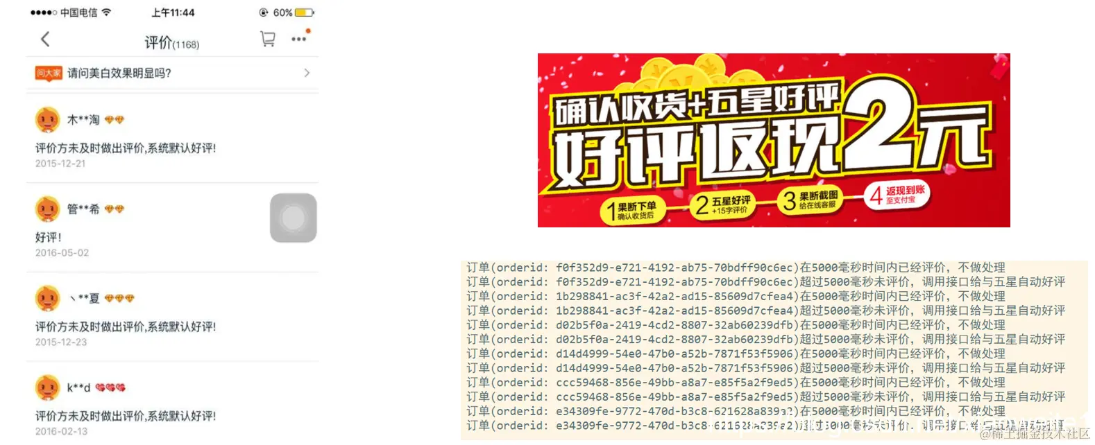 * Desc 在电商领域会有这么一个场景,如果用户买了商品,在订单完成之后,一定时间之内没有做出评价,系统自动给与五星好评,