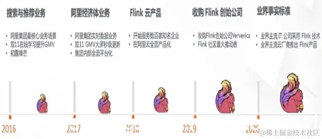 2015 年阿里巴巴开始使用 Flink 并持续贡献社区(阿里内部还基于Flink做了一套Blink)