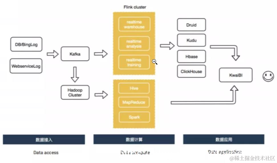 快手计算链路是从 DB/Binlog 以及 WebService Log 实时入到 Kafka 中,然后接入 Flink 做实时计算,其中包括实时数仓、实时分析以及实时训练,最后的结果存到 Druid 、 Kudu 、 HBase 或者 ClickHouse 里面;