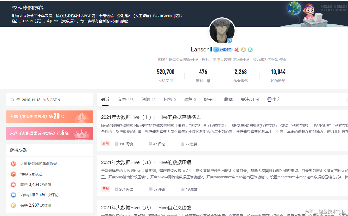 2021大数据领域优质创作博客,带你从入门到精通,该博客每天更新,逐渐完善大数据各个知识体系的文章,帮助大家更高效学习。
