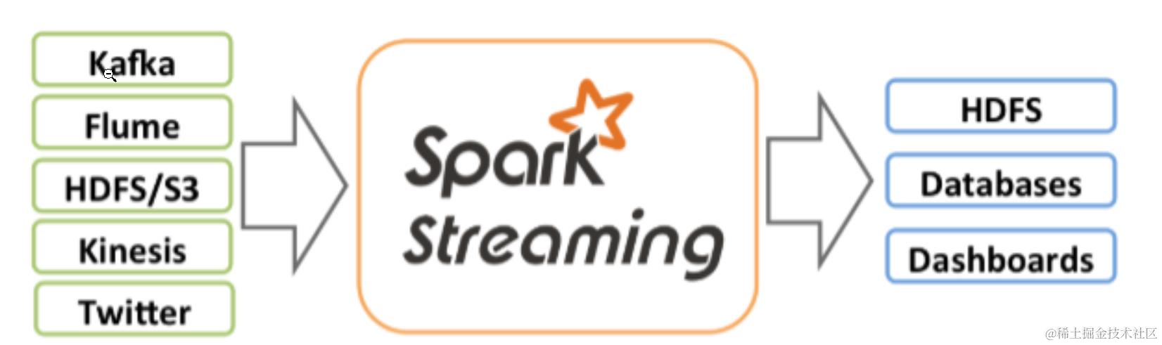 Sparking Streaming 可以整合多种输入数据源,如 Kafka 、 Flume 、 HDFS 、 TCP socket 等等,经过处理的数据可 以存储到HDFS 、数据库和 Dashboard 等等。