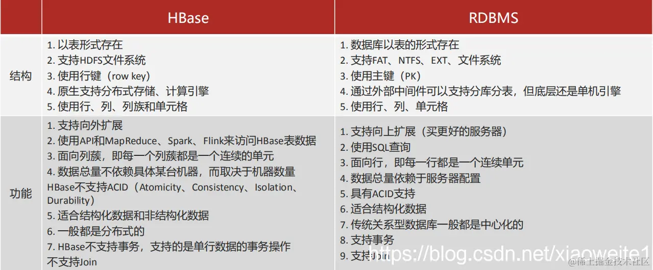- Hbase查询数据功能很简单,不支持join等复杂操作,不支持复杂的事务(行级的事务),从技术上来说,HBase更像是一个「数据 存储」而不是「数据库」,因为HBase缺少RDBMS中的许多特性,例如带类型的列、二级索引以及高级查询语言等