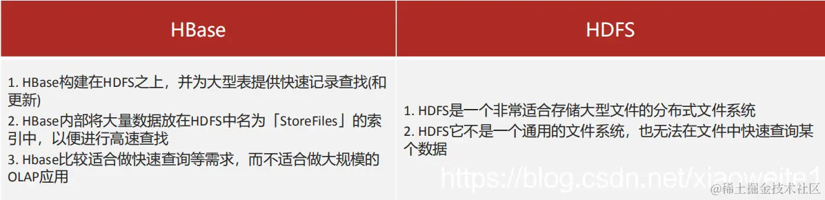 - Hadoop/HDFS集成: HBase支持HDFS开箱即用作为其分布式文件系统