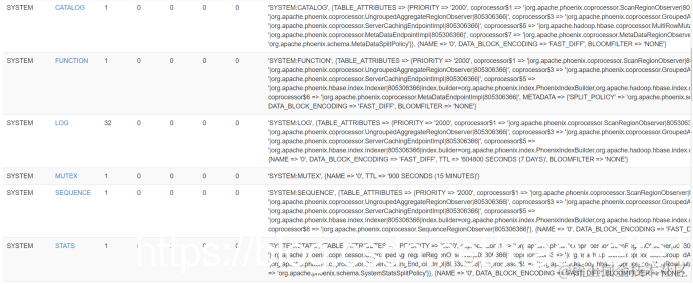 7、查看HBase的Web UI,可以看到Phoenix在system命名空间下创建了一些表,而且该系统表加载了大量的协处理器。