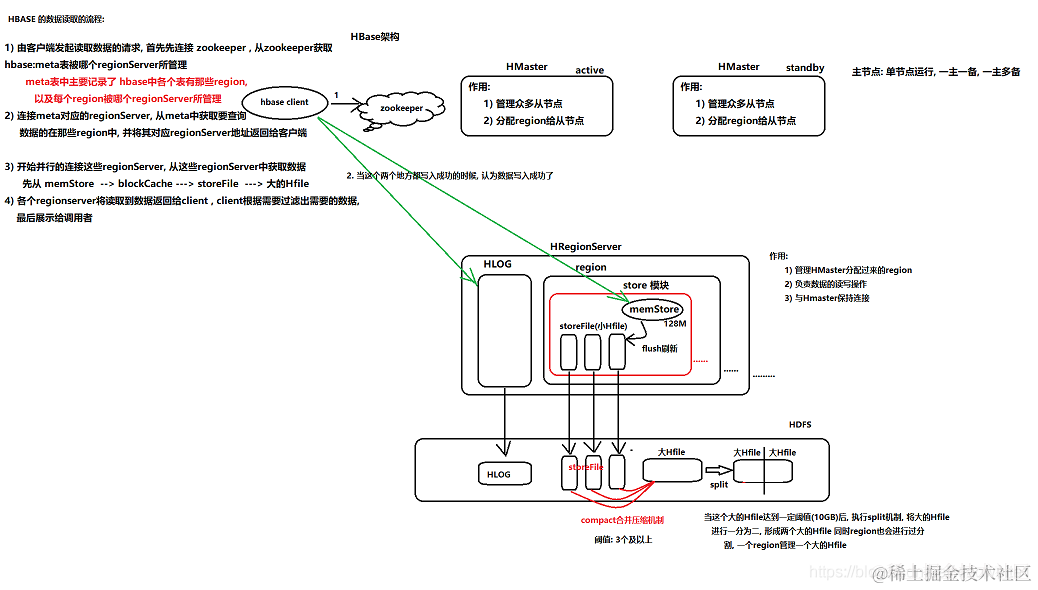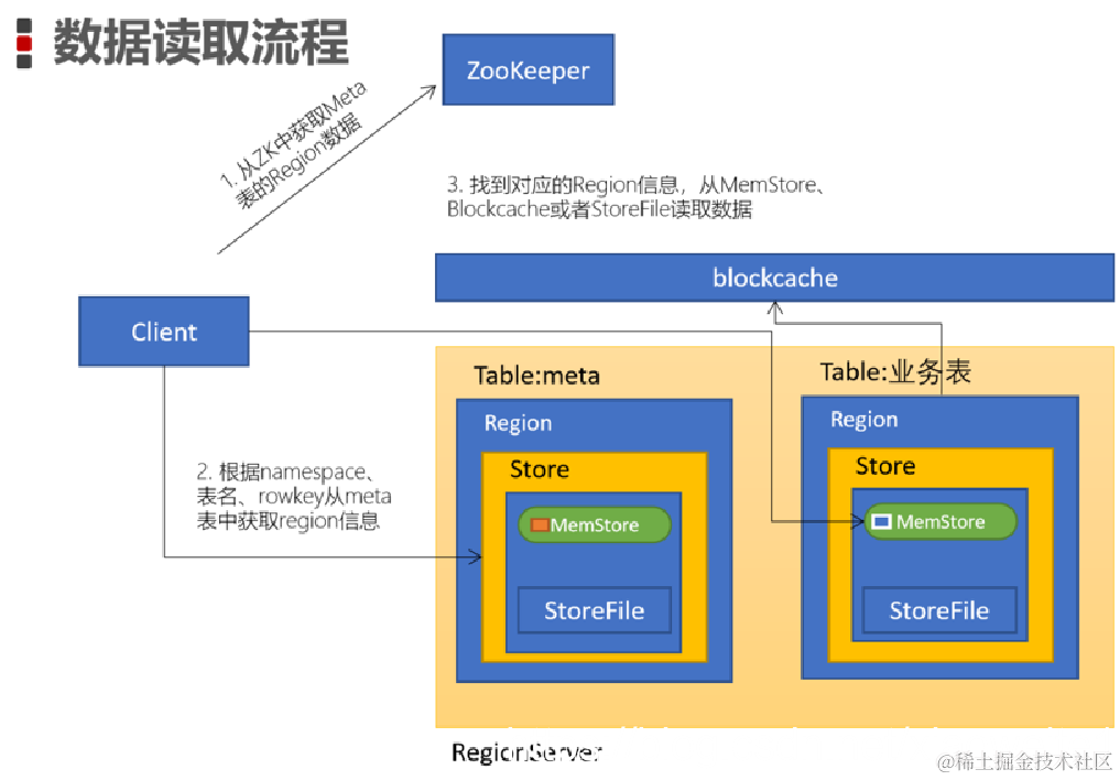1、由客户端发起读取数据的请求, 首先先连接 zookeeper , 从zookeeper获取hbase:meta表被哪个regionServer所管理meta表中主要记录了 hbase中各个表有那些region,以及每个region被哪个regionServer所管理hbase中非常特殊的元数据存储表, 此表只会有一个region