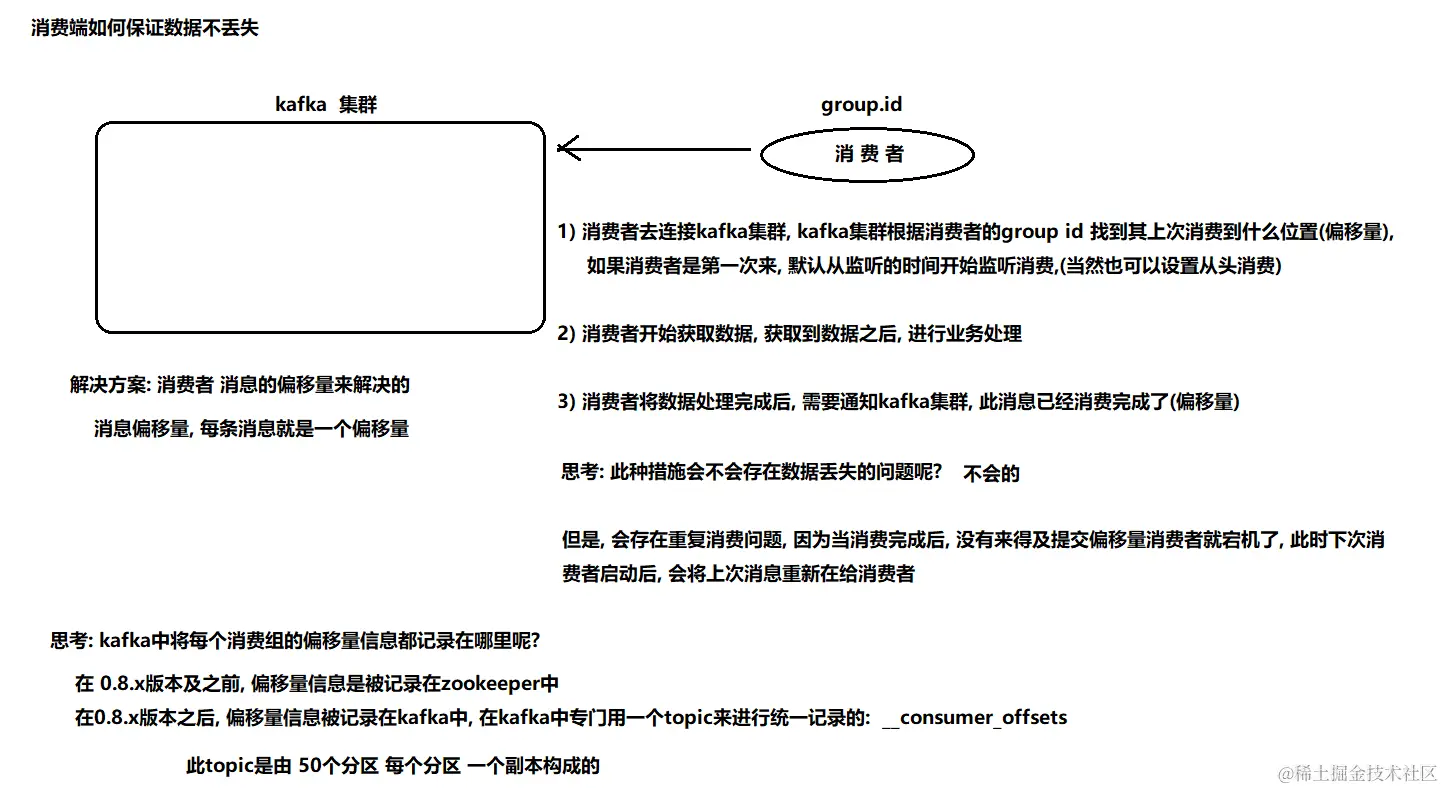 而offset的信息在kafka0.8版本之前保存在zookeeper中,在0.8版本之后保存到topic中,即使消费者在运行过程中挂掉了,再次启动的时候会找到offset的值,找到之前消费消息的位置,接着消费,由于offset的信息写入的时候并不是每条消息消费完成后都写入的,所以这种情况有可能会造成重复消费,但是不会丢失消息。