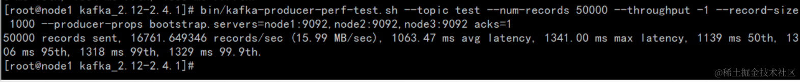 bin/kafka-producer-perf-test.sh --topic test --num-records 50000 --throughput -1 --record-size 1000 --producer-props bootstrap.servers=node1:9092,node2:9092,node3:9092 acks=1