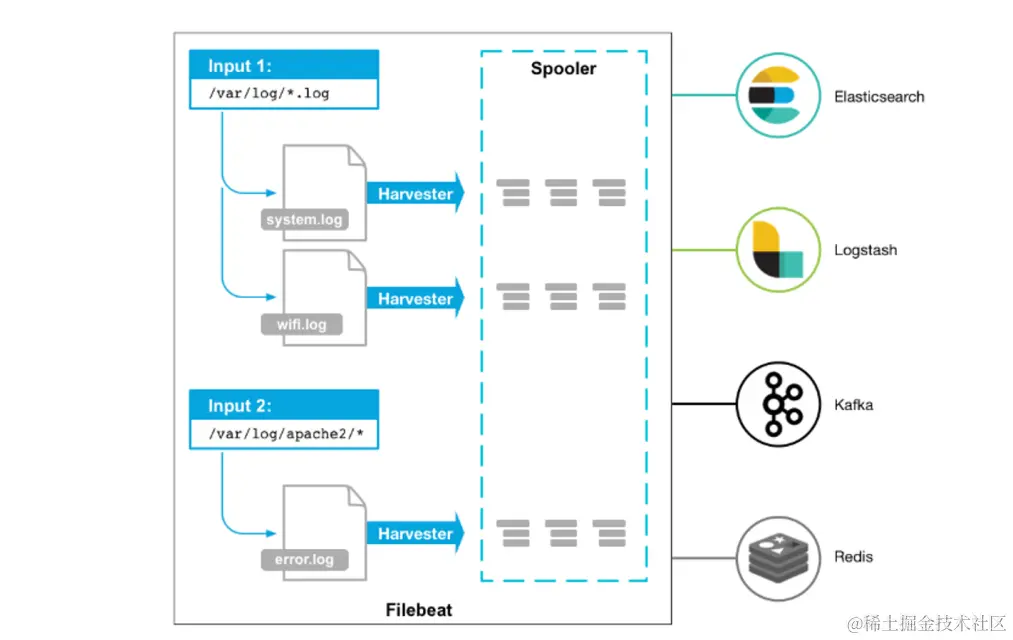 启动FileBeat时,会启动一个或者多个输入(Input),这些Input监控指定的日志数据位置。FileBeat会针对每一个文件启动一个Harvester(收割机)。Harvester读取每一个文件的日志,将新的日志发送到libbeat,libbeat将数据收集到一起,并将数据发送给输出(Output)。