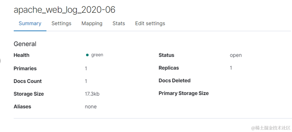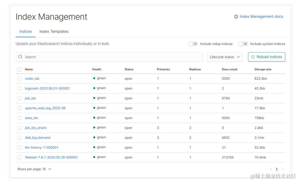 点击 按钮,再点击 「Index Management」,可以查看到Elasticsearch集群中的索引状态。