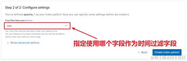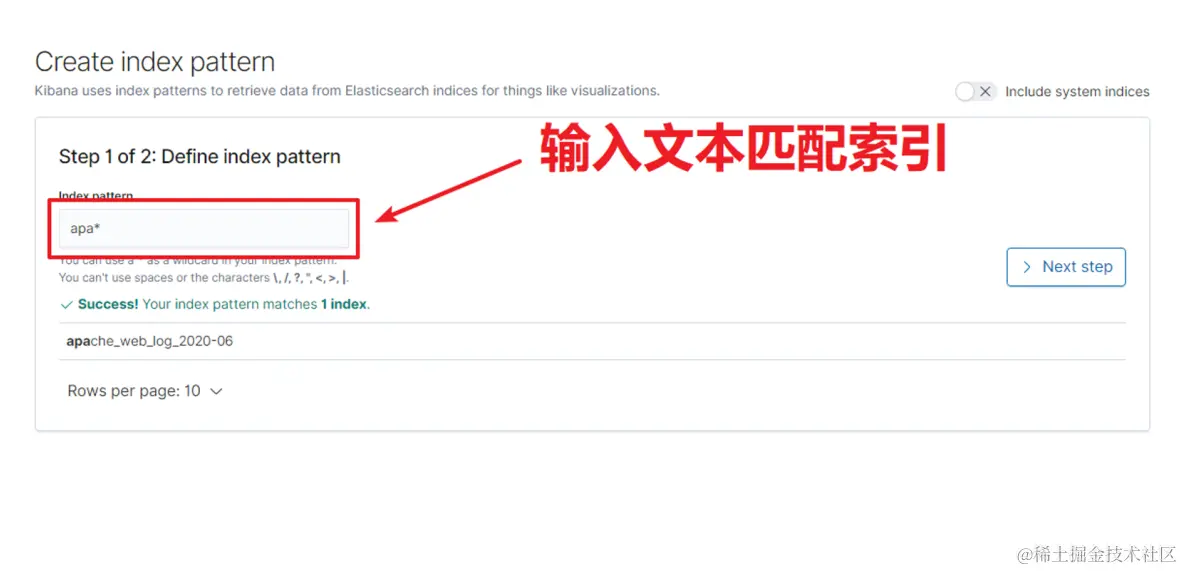1、定义索引模式,用于匹配哪些Elasticsearch中的索引。点击「Next step」