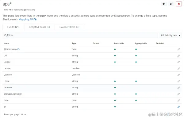 3、点击「Create Index Pattern」按钮,创建索引模式。创建索引模式成功后,可以看到显示了该索引模式对应的字段。里面描述了哪些可以用于搜索、哪些可以用来进行聚合计算等