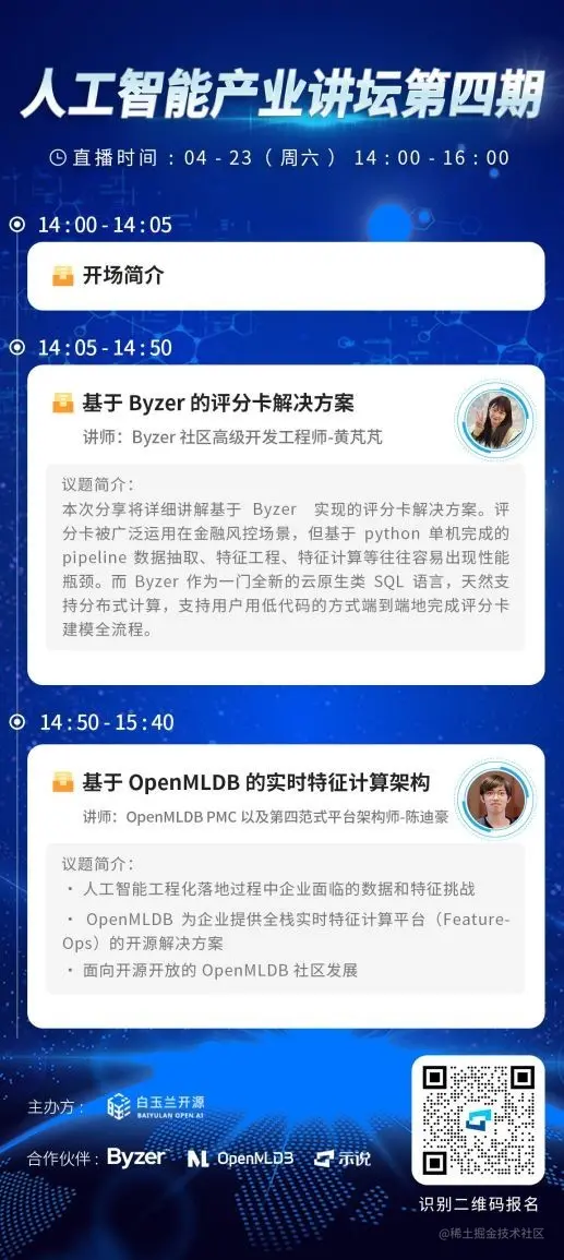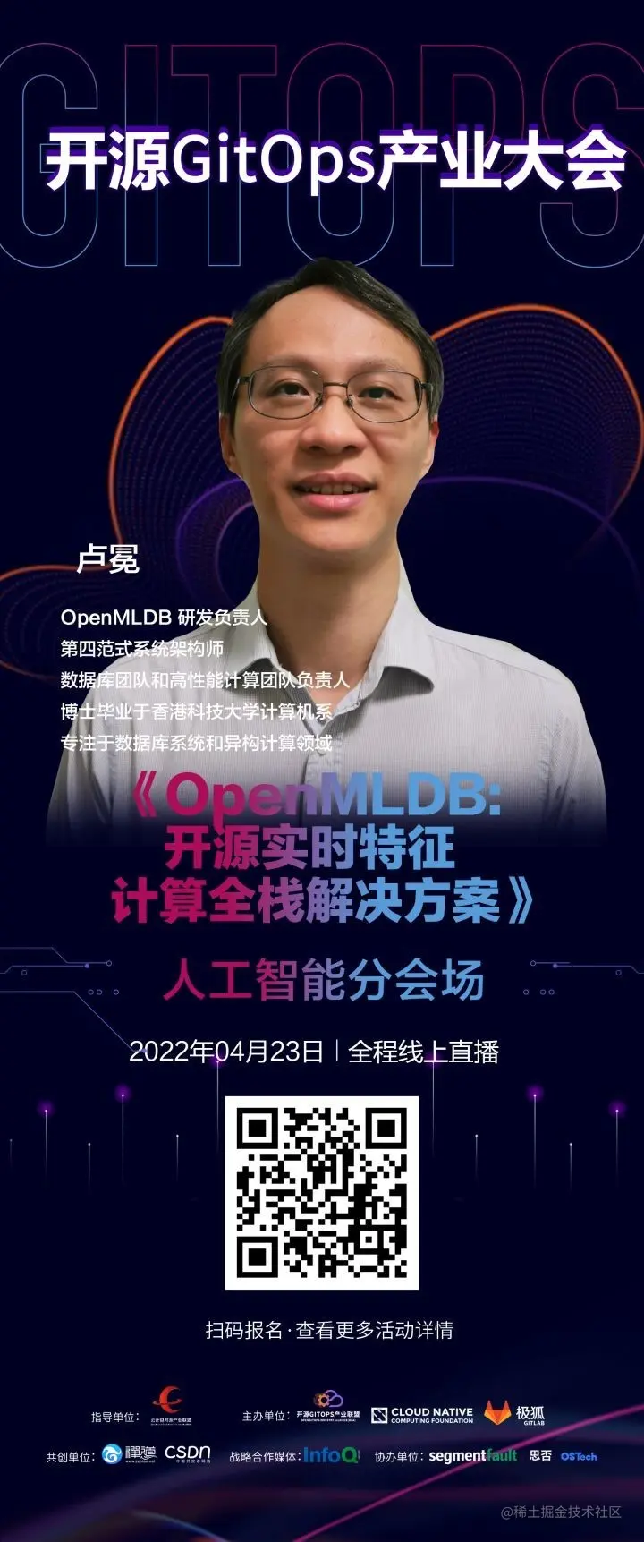 上午9:45-10:30,OpenMLDB 研发负责人卢冕应邀进行以“OpenMLDB:开源实时特征计算全栈解决方案”为主题的相关分享,欢迎大家报名观看。