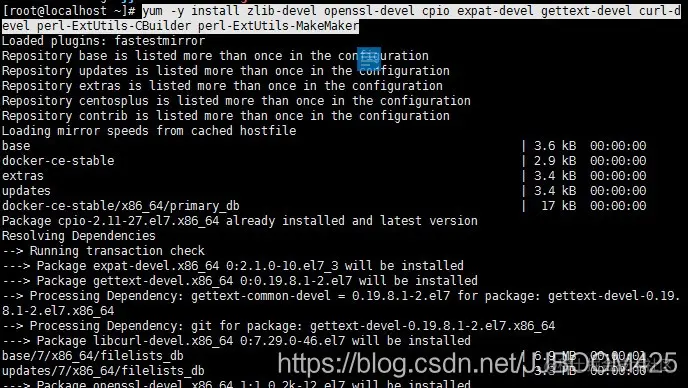 我们在命令行中输入 yum -y install zlib-devel openssl-devel cpio expat-devel gettext-devel curl-devel perl-ExtUtils-CBuilder perl-ExtUtils-MakeMaker install后面都是需要安装的依赖,这里解释一下这些是干啥的。