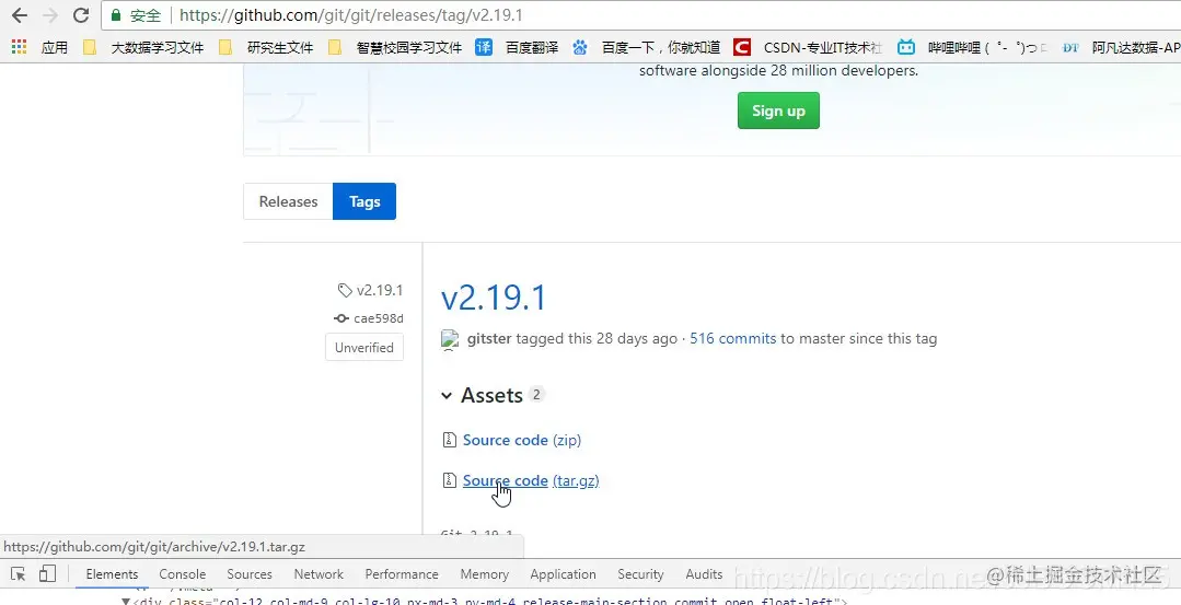 这里有两种方式,第一种可以直接登录 Releases · git/git · GitHub 上看git的版本(现在已经出到了 v2.19.1版本),然后直接下载相应的压缩包。第二种就是直接在centOS的命令行中输入 wget github.com/git/git/arc… 进行下载。