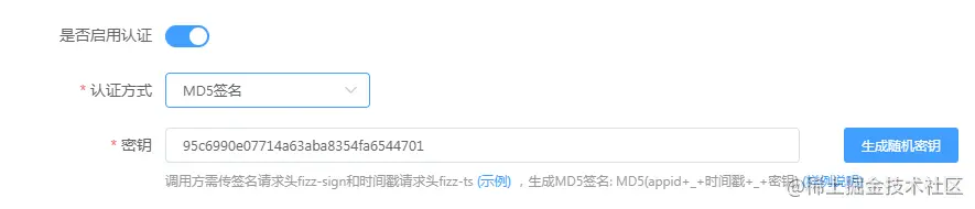 管理后台可配置应用的认证方式,当前支持 md5、密钥、自定义 3 种方式。