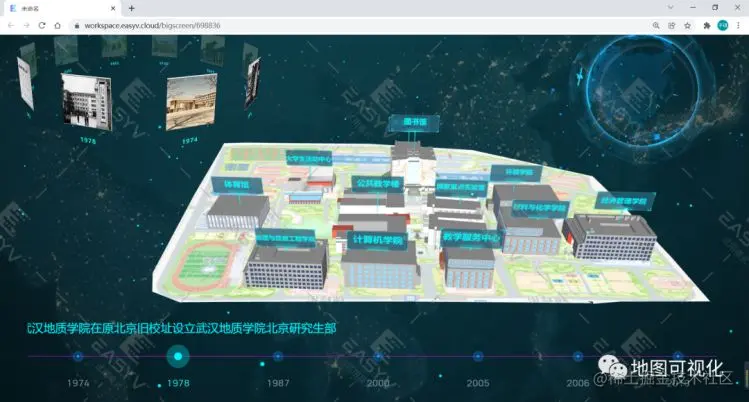 此界面以文字和上方3D图片列表的形式展示了中国地质大学由1952年建校到2019年未来城校区启用的历史,图文并茂,达到了较好的可视化效果。