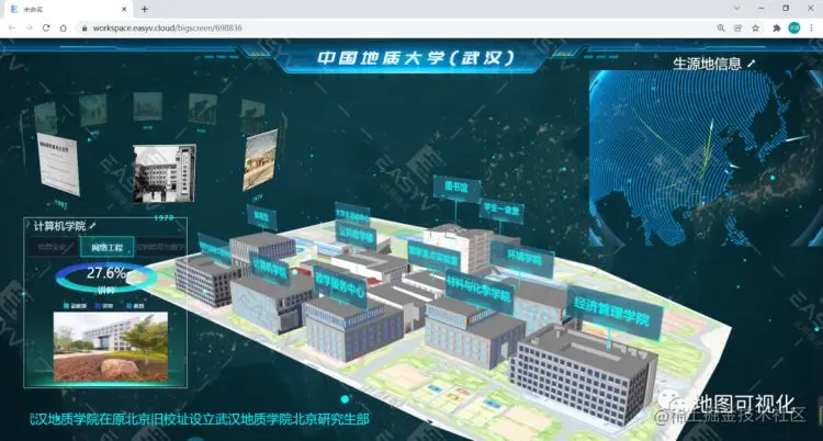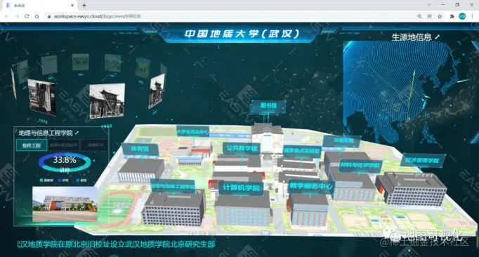 在EasyV数字孪生可视化平台的助力下,中国地质大学(武汉)地理与信息工程学院地理信息科学专业学生李子琪、邵轶辉所在小组成功实现了校园地理信息可视化展示,为地大送出一份弥足珍贵的七十华诞礼物。