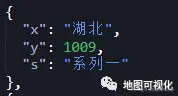 首先从组件中添加柱状图组件;其次在样式选项卡中添加不同的样式,并为不同的样式赋值;然后在数据选项卡中,加入所处理的数据,数据格式如下所示,其中x表示横坐标即省份,y表示纵坐标即地大在各省份的录取人数,s表示所使用的的样式的值;最后在对整个统计图进行宏观调整。