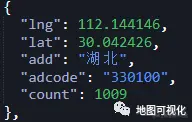 其次是数据的添加,在3D边界地图控件添加三个标牌柱子控件,分别反映三年地大在各地区的录取人数,数据格式如下所示,lng表示经度,lat表示纬度,add表示地点名称,addcode表示地区编号,count表示数值大小,需要根据录取人数按降序排列以展示排名。最后再调整一些细节信息,如光柱的粗细、升起时间、交互方式等。