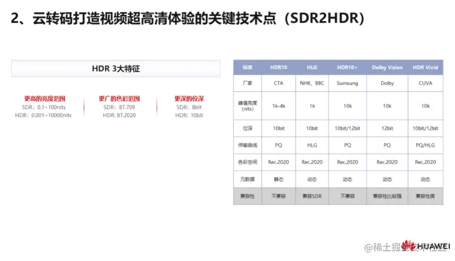 另外一个关键技术点,我们看一下近几年发展较快的一项技术,SDR 2HDR 。HDR由于其相比SDR具有更高的亮度范围、更广的色彩范围和更深的位深而被大家所熟知,对应带来的是视频具有更丰富的细节,更宽广的色域和更自然的色彩过渡。我们可以看到上图中SDR和HDR的对比,在亮度、色彩饱和度以及对比度上,能明显地感受到HDR的图片带来的视觉效果更好一些。另外,当前HDR领域也出现了不同的标准,从图表中可以看到这些标准在不同维度的差异。