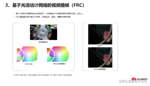 针对视频插帧的任务,华为云提出了一种耦合光流网络模型,这种光流网络模型可以准确地估计出前后两帧之间的光流,在一些困难的场景,比如说小物体快速运动、遮挡等场景,光流估计都比较准确。如图是一个例子,左边是目前比较先进的视频插帧算法RIFE估计的光流,右边是华为云自研算法估计的光流。大家可以不关注这些颜色代表的含义,仅从形状上来看,可以看出右边的光流模型估计出的光流会更细腻一些,细节会更丰富一些。