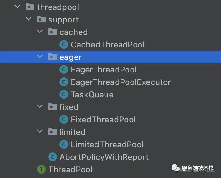 cached缓存线程池,空闲一分钟自动删除,需要时重建。 limited可伸缩线程池,但池中的线程数只会增长不会收缩。只增长不收缩的目的是为了避免收缩时突然来了大流量引起的性能问题。eager优先创建Worker线程池。在任务数量大于corePoolSize但是小于maximumPoolSize时,优先创建Worker来处理任务。当任务数量大于maximumPoolSize时,将任务放入阻塞队列中。阻塞队列充满时抛出RejectedExecutionException。(相比cached:cached在任务数量超过maximumPoolSize时直接抛出异常而不是将任务放入阻塞队列)