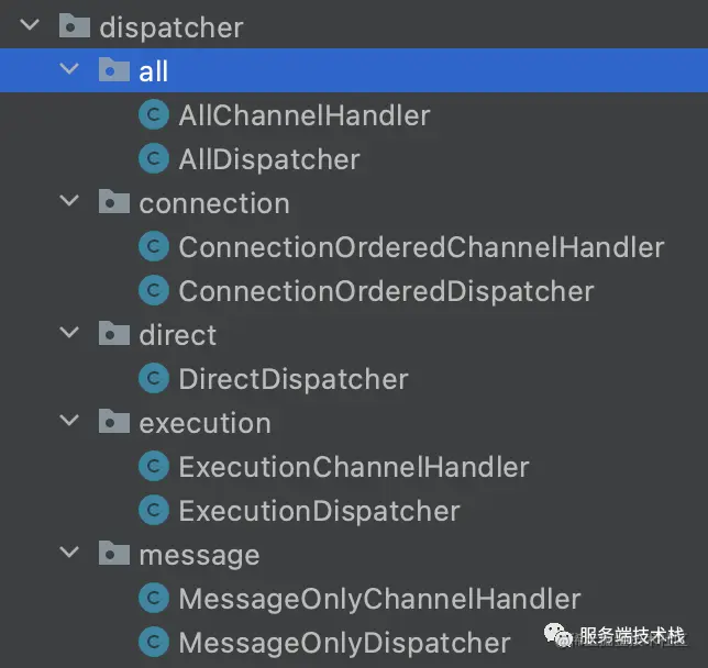 dubbo总共有5类线程分发器,不同的线程分发器代表不同的线程派发策略,表示哪类消息会使用dubbo自身的线程池处理,默认使用AllDispatcher。