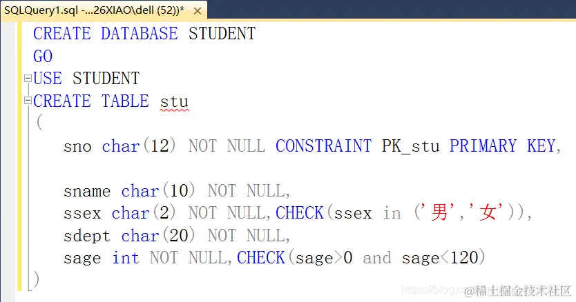 1.自建数据库,在数据库中创建一个stu(sno,sname,ssex,sdept,sage)表,通过constraint关键词为列添加约束条件,其中:sno为主键,ssex 的取值男或女,sage取值范围(0-120)。