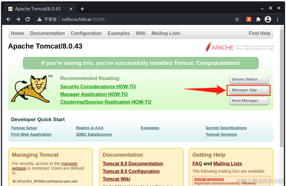 1、打开靶场环境,并点击Manage App链接,通过弱口令登录平台,账号密码均为:tomcat