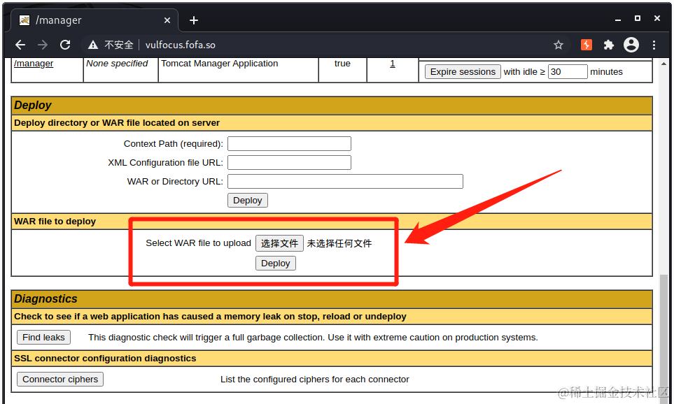 2、拖动页面,找到war上传区域,上传jsp木马:
