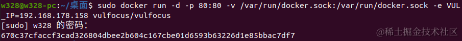 sudo docker run -d -p 80:80 -v /var/run/docker.sock:/var/run/docker.sock -e VUL_IP=your-ip vulfocus/vulfocus