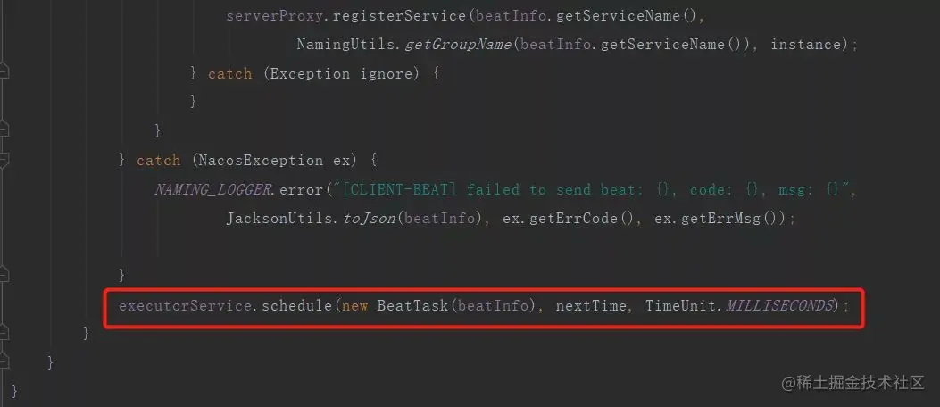 这行代码就是重新构建了一个BeatTask,,然后重新扔到调度线程池,等待nextTime之后执行。nextTime一般是BeatInfo的period,也就是默认是5s,但是有种情况,就是当发送心跳的实话,服务端可能会响应给客户端一个下一次发送心跳的时间间隔,此时就以nextTime就是服务端响应的时间,你可以自行查看nextTime的赋值情况。