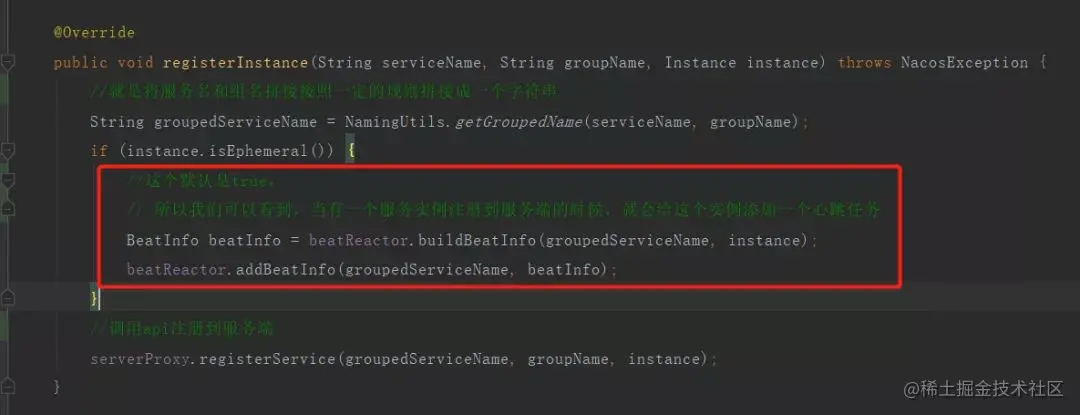 第二步,这个if条件,默认是true,不信你可以点进去看一下,这一步是创建一个心跳的任务,从这里我们可以看出,默认的情况下,nacos会为每个服务实例创建一个心跳。只不过一般一个客户端只会注册一个服务实例(想一想,哪个框架一个客户端可能会注册多个服务实例,公众号有剖析过这个框架)。